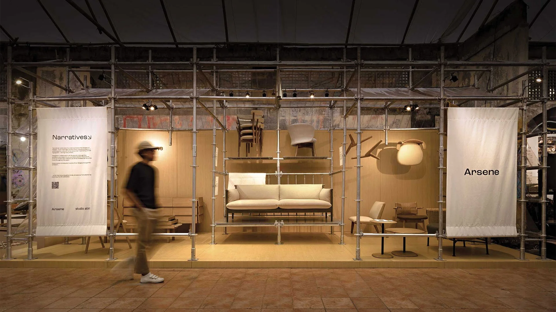 In keeping up with our sustainability commitments, most of the components used in making this booth have been either rented, or repurposed. The booth’s main structure consisting of rented scaffolding feels appropriate given the theme of the event, as well as being a symbolic gesture as Arsene builds up its presence in the industry.