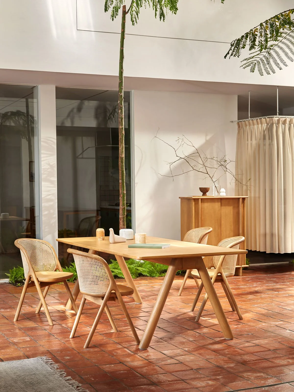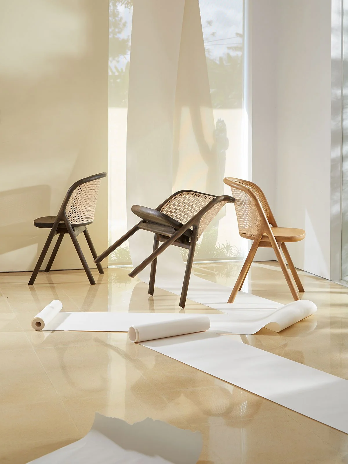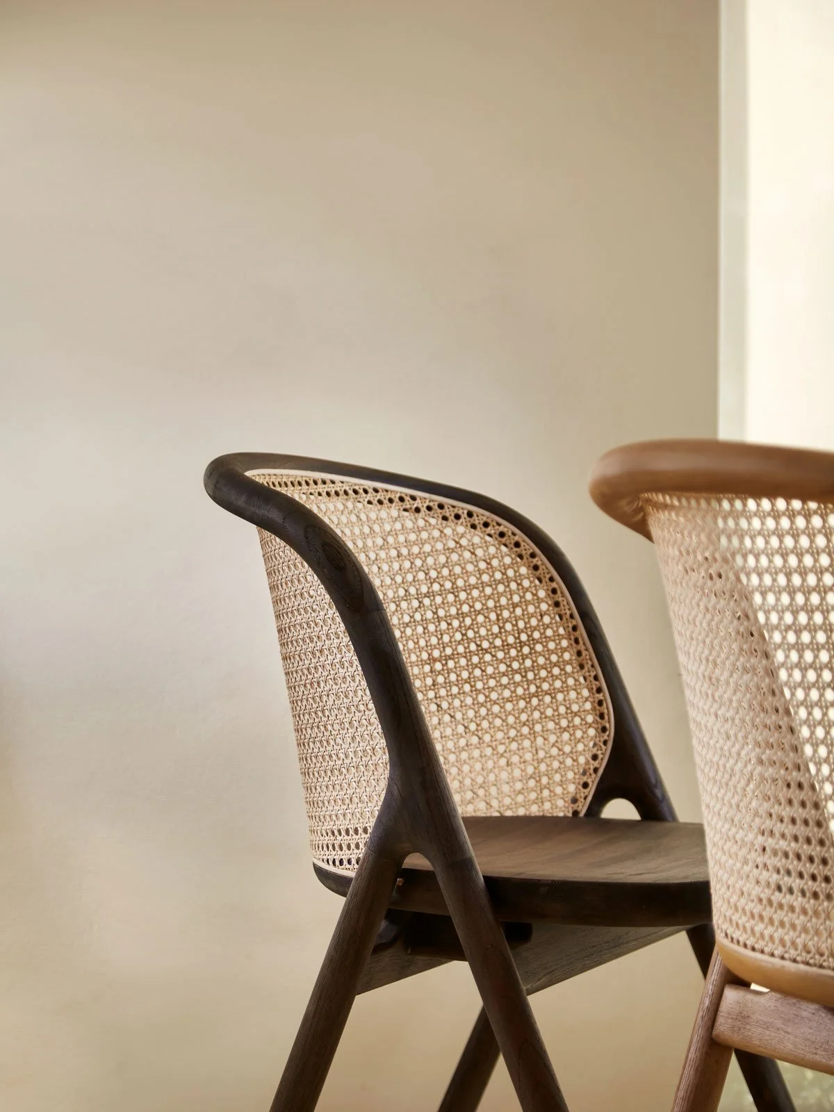 Framing the rattan cane detailing, its distinctive side profile loops around the back to form a supportive, enveloping backrest—inviting its users to, well… enter.