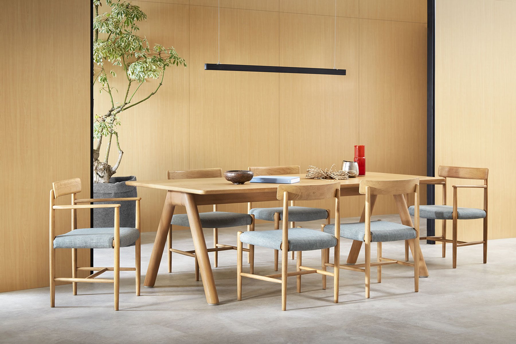 MU03 Muon Chair w. Upholstery, MU04 Muon Chair w. Arms, w. Upholstery, HA05 Hairu Rect. Dining Table