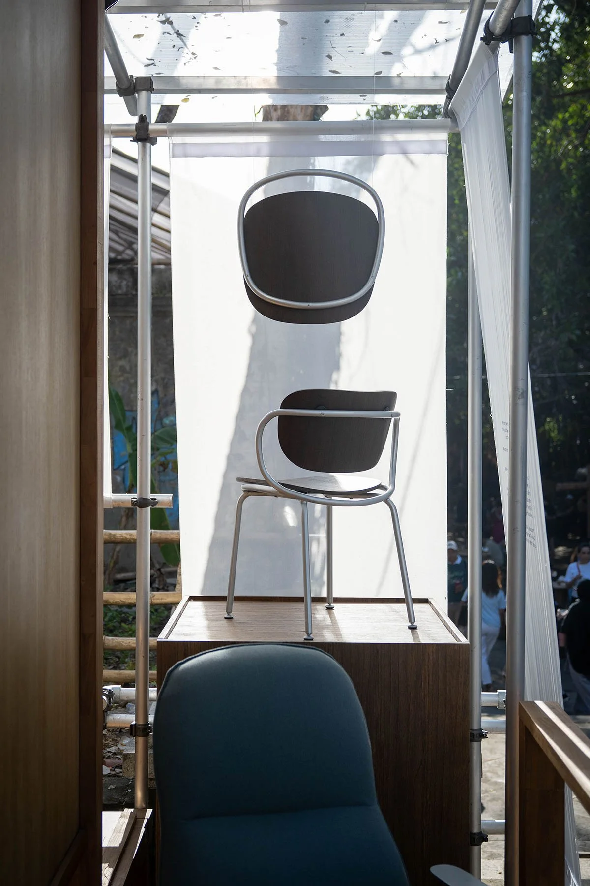 The chair is visually defined by its two oblong-shaped plywood shells: one backrest and one seat, each mirroring the contour of the metal underframe they sit on. Instead of aligning them concentrically within the frame, the seat and backrest are set slightly off centre—an intentional offset that introduces a subtle separation between the two distinct materials.