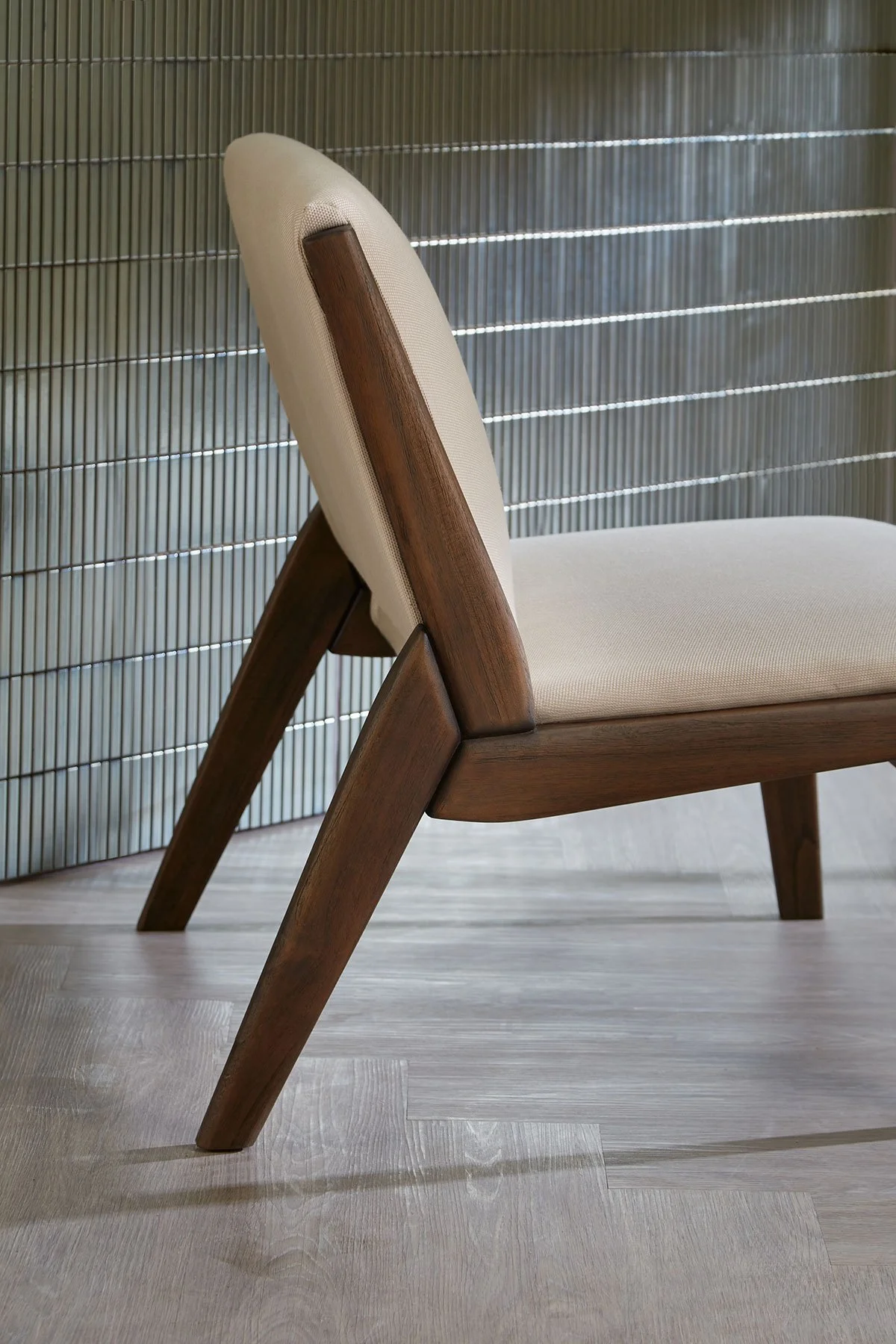 Featuring a Jean Prouvé-like construction, the ‘blades’ converge towards the rear legs, where chairs take the most stress when used. The three-way joint eliminates the need for a cross brace, simplifying the structure—a testament to Prouvé’s philosophy of honest construction.