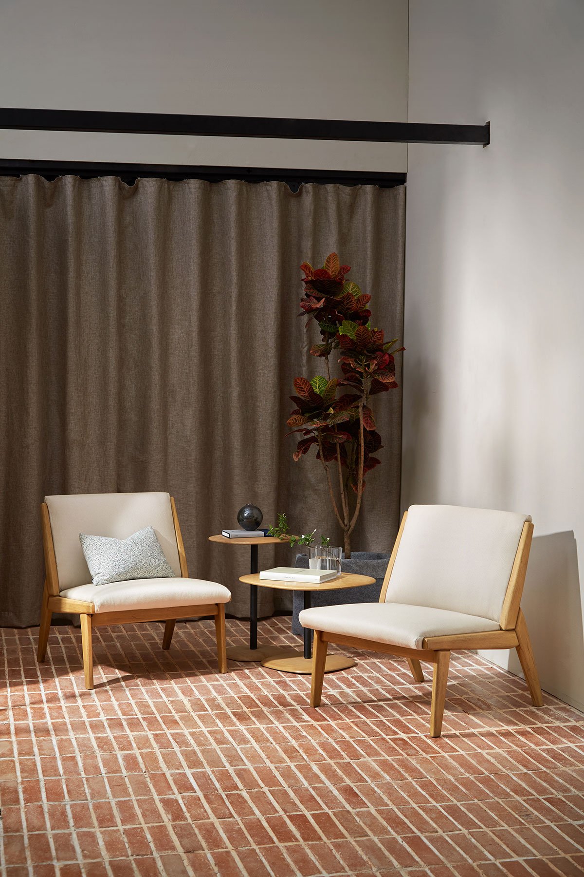 PL03 Plata Shelf 3 Columns, PL07 Plata Side Table, Stone Top, FT03 Futon 2.5 Seater Sofa, TU01 Turbine Lounge Chair
